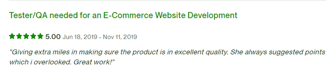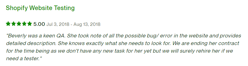 Beth was hired as a BA and QA. She did an excellent job.. was managing a small team of 4 devs and working across the project as a BA and helping devs with testing.. great communicator, always on chats, easy to work with.. highly recommended